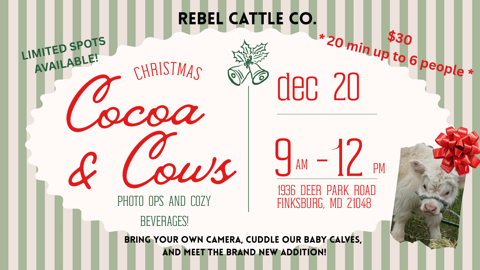 Each tickets gets you 20 mins of calf cuddling for up to 6 people (and all the photos you’d like). You may purchase more than one time slot if you need more time! Several photo ops Available inside and out of the barn. Bring your own camera (photographers welcome)